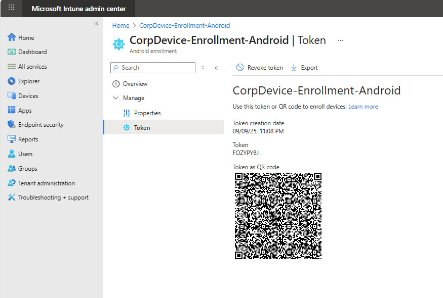 Kamera açıldıktan sonra daha önceden oluşturmuş olduğum “Android Corporate-owned devices with work profile” içerisindeki Policy’e gelerek “Token” kısmını açıp karekod okutuyorum. İlgili makale bu Link’tedir.