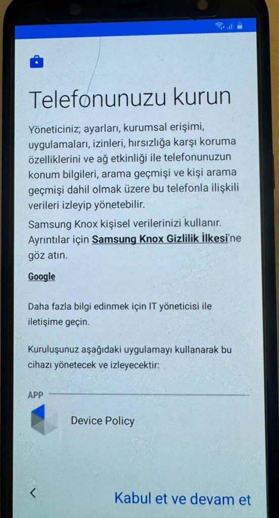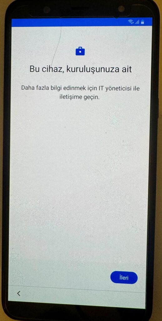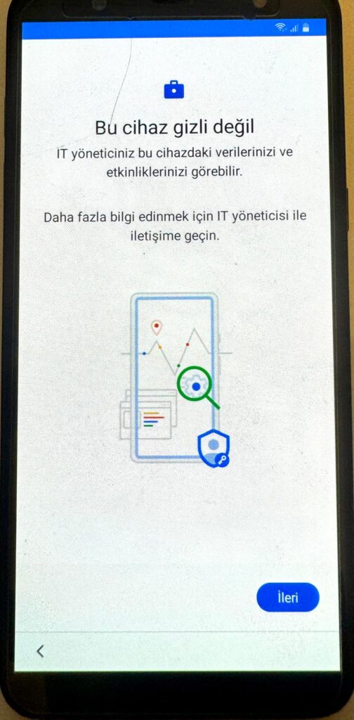 Cihazın şirket cihazı olduğunu ve verilerin IT tarafından yönetilebileceğini iletmektedir.